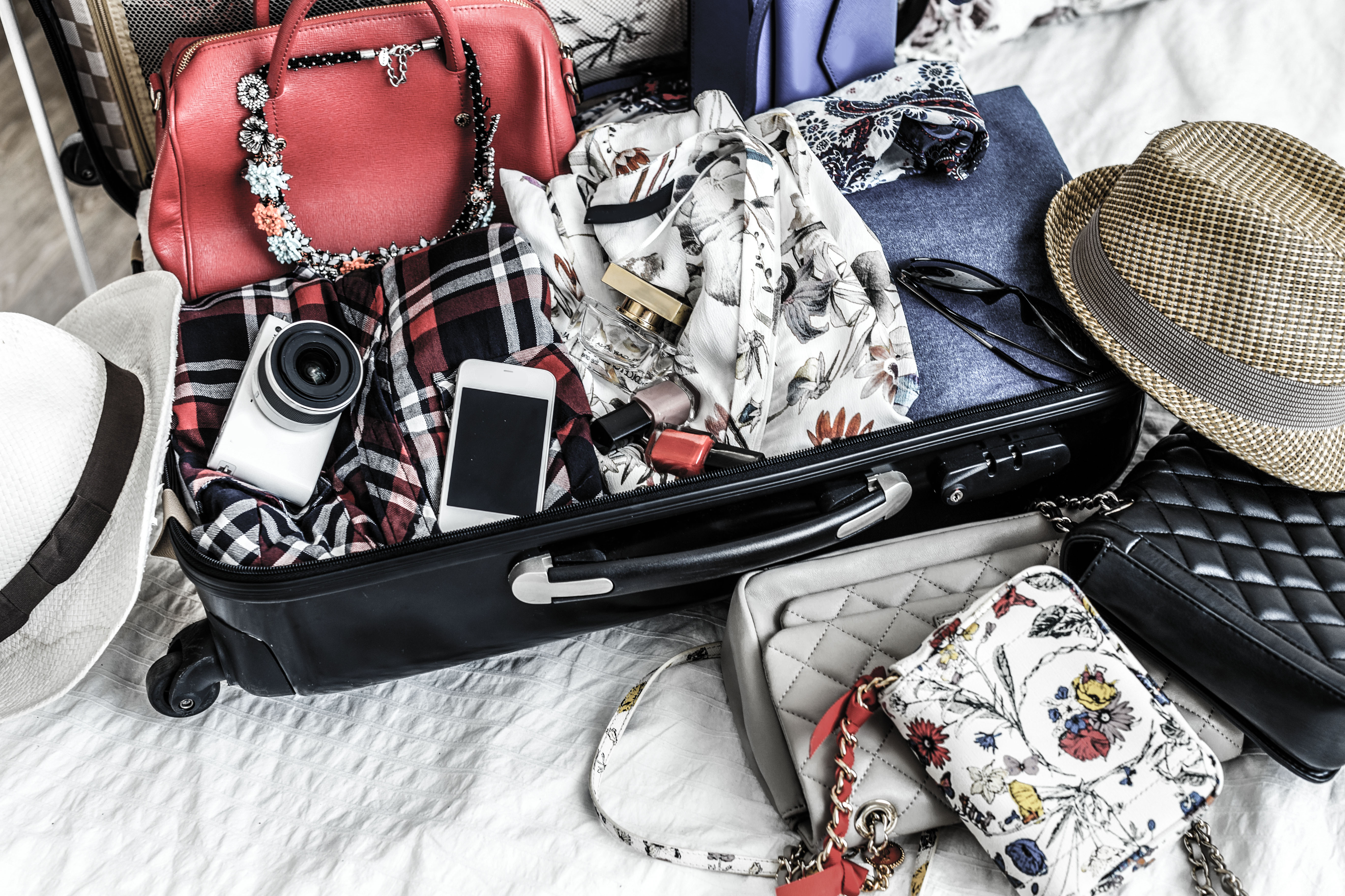 Computer bag with laptop, iPad, purse (jam it in), travel pillow, make-up and all chargers – check